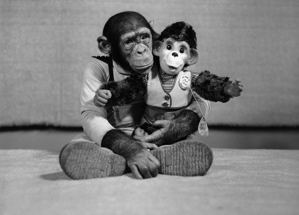 03 Nov 1955, Hollis, Long Island, New York, USA — Hollis, Long Island: Huggs Raids Toy Factory. Television’s celebrated monkey-shiner “Muggs” by name or to be technical, “J. Fred Muggs” took things into his own hands today when he was let loose in the Hollis, Long Island Toy Factory. It didn’t take Muggs long to find a kindred spirit among the toys, and anyone with intentions of separating Muggs from his newly-acquired friend would be wise to take along a little protective equipment. The doll which bears a striking resemblance to Muggs is all togged out in the best doll chimp fashion. It also has quite a few tricks in its bag–walking, talking, sleeping, etc. — Image by © Bettmann/CORBIS